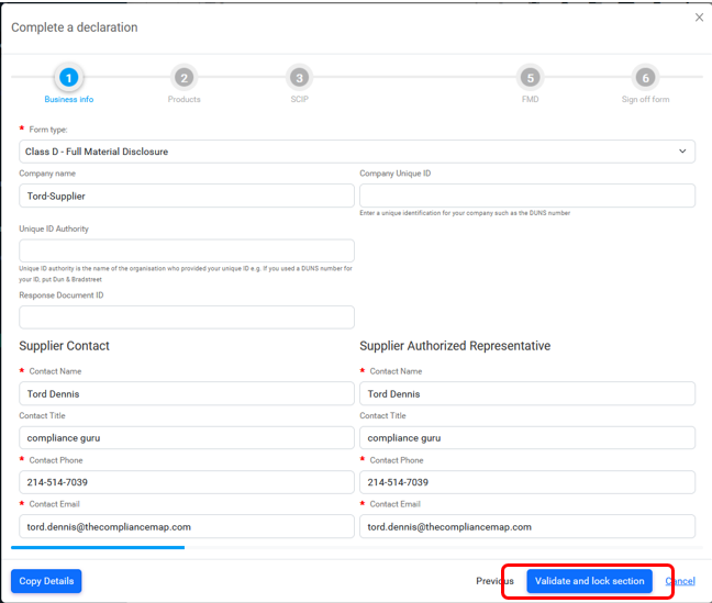 Click the Validate and lock section button when done completing the mandatory fields. Correct any errors as applicable.