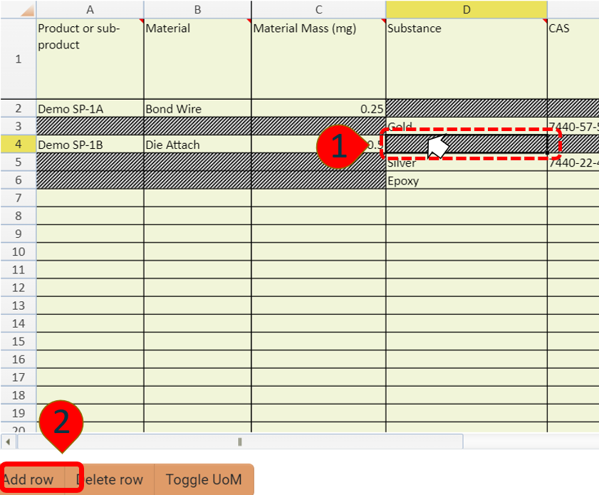 If you want to add an additional chemical to an existing Product or Sub-Product, click the cell beneath the existing Substance field and pick Add row.