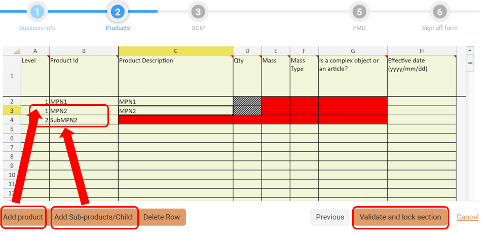 e.g. if you have a Level 1 product listed, when you click Add Sub-Products, the row below will become Level 2.