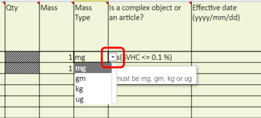 Click in the appropriate cell to add data to the mandatory fields in red.