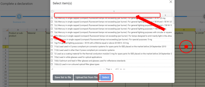 As well as drop-down assistance, when clicking into certain fields a Select Item(s) window will open where you will be presented with a list of pre-determined statements. The Exemptions column is a good example of this (screenshot below).