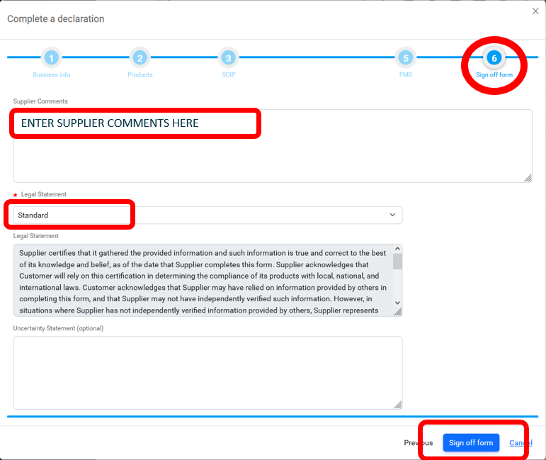 Use the Supplier Comments field to enter any comments you wish to send to your customer regarding this declaration