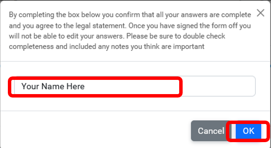 Enter your name in the Sign off name field, a minimum of 5 characters is required
