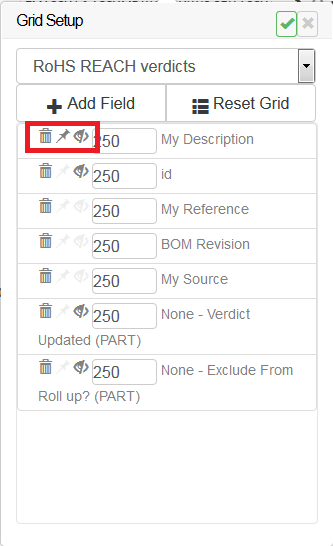 Alternatively, the view can be customised per user by adding items using the Add Field button. This will open a new window where items can be searched for and selected. Once selected the user has the option to Delete, specify if the column is frozen in view or hidden from view altogether using the three icons highlighted below. In addition the column width can be set by specifying a width value.