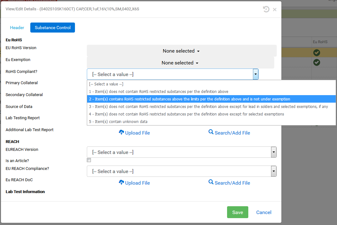 Users will also need to manually set the compliance status specified in the collateral by selecting appropriate statement from the drop-down box. In addition, for Eu RoHS any specified exemptions can be selected from the Eu Exemption drop-down