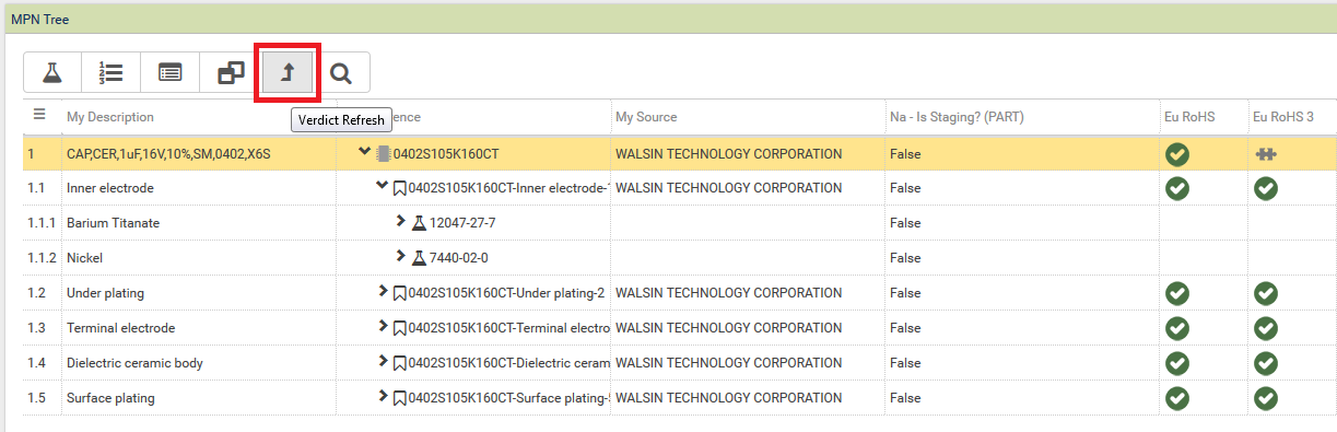 Each time values are updated that may affect the compliance verdict the line(s) in question are highlighted in red indicating that the verdict needs to be refreshed. This will happen automatically every 24 hours but can be triggered manually per part as follows;