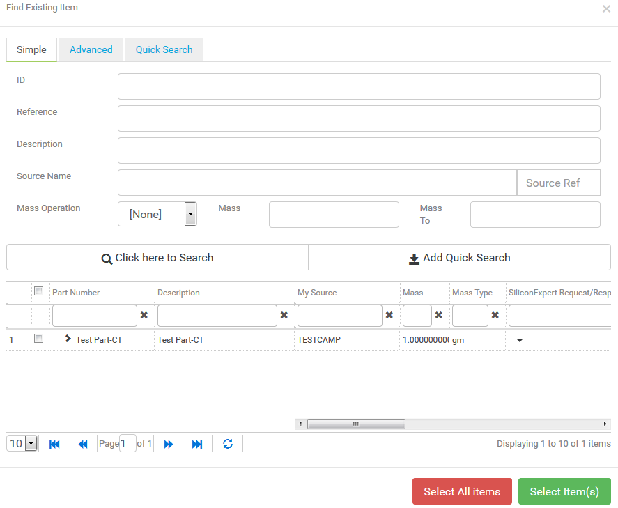 Step 3 - Click the 'Part(s)' button and then use the Search screen to locate and the pick 1 or more