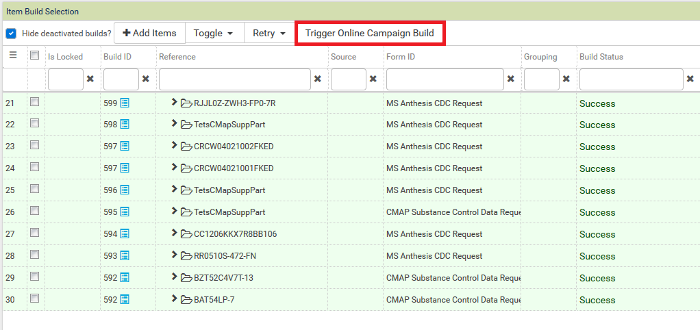 Step 4 - The items will then be added to the campaign queue. The request will process automatically within 60 minutes but to process the requests immediately, click the 'Trigger Online Campaign Build' button at the top of the page.