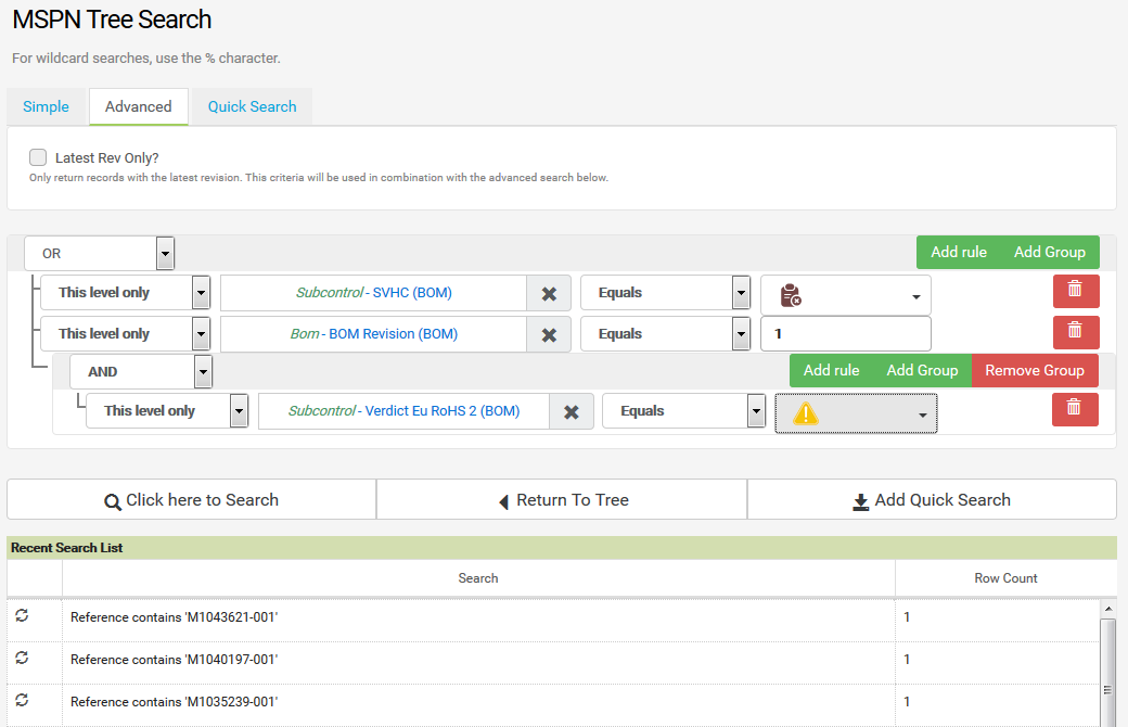 So in the example below CMAP will return items where SVHC substances exist OR BOM Revision equals 1 AND the Eu RoHS 2 verdict is Compliant by Exemption.